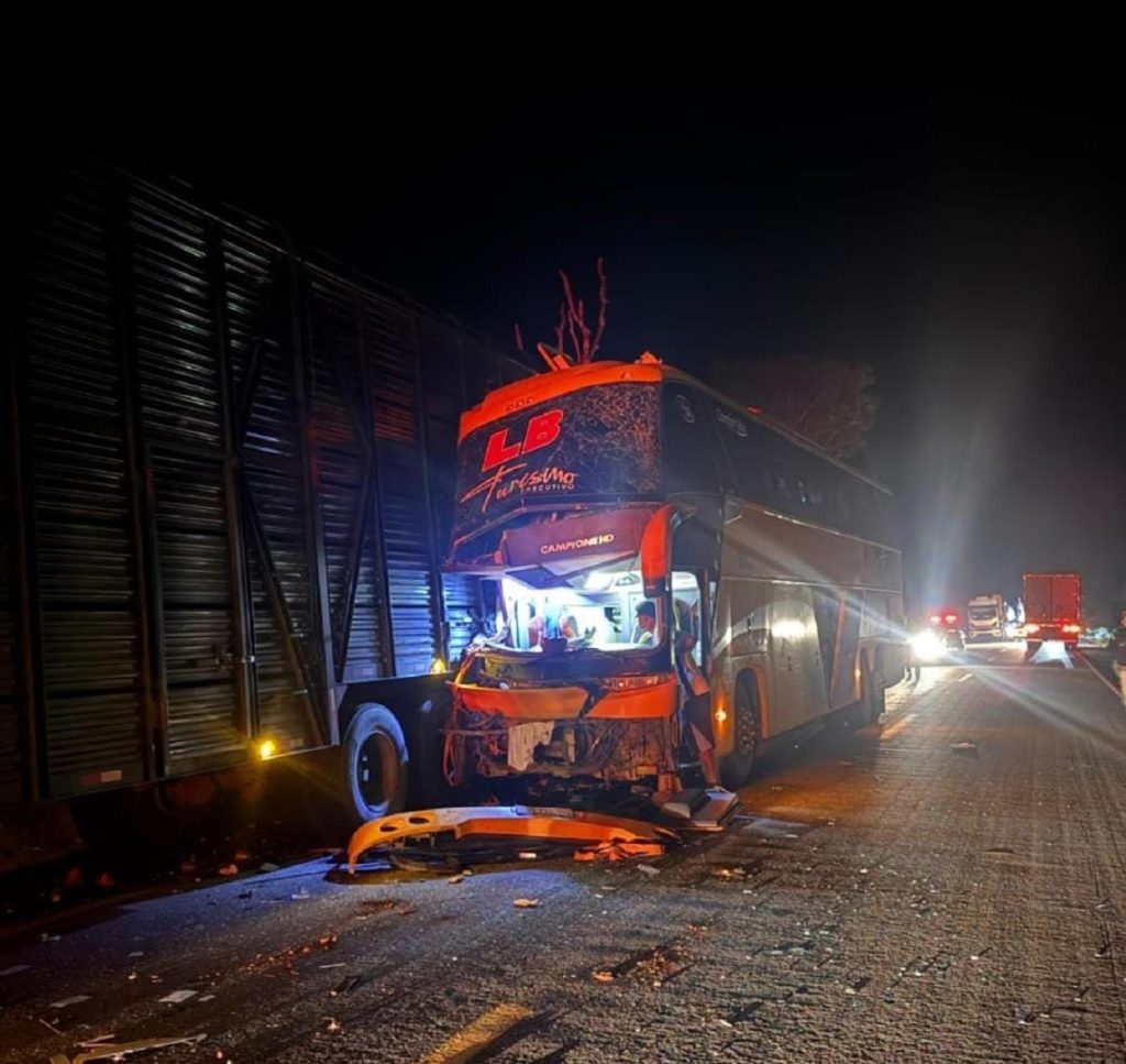 Veja situação de veículos após acidente entre ônibus de time e caminhão